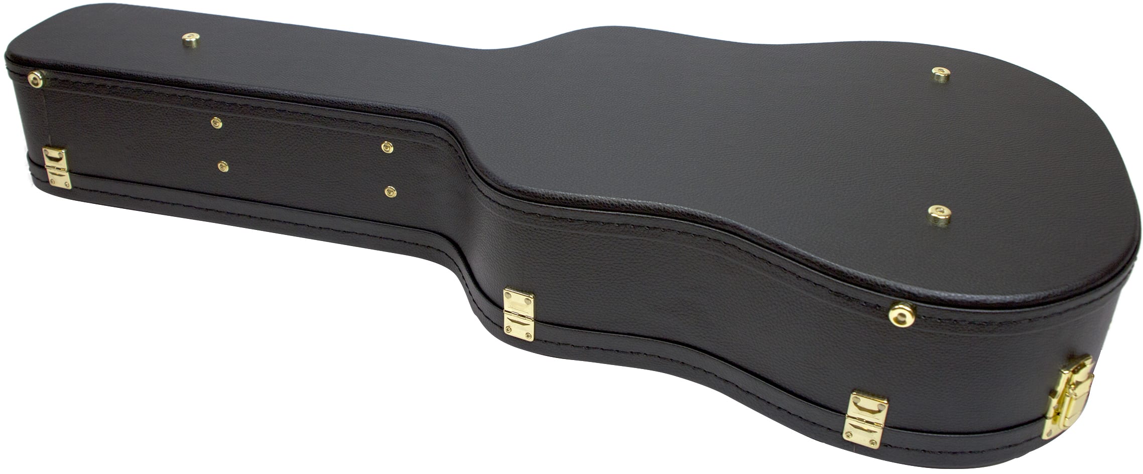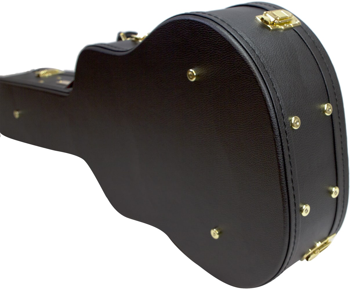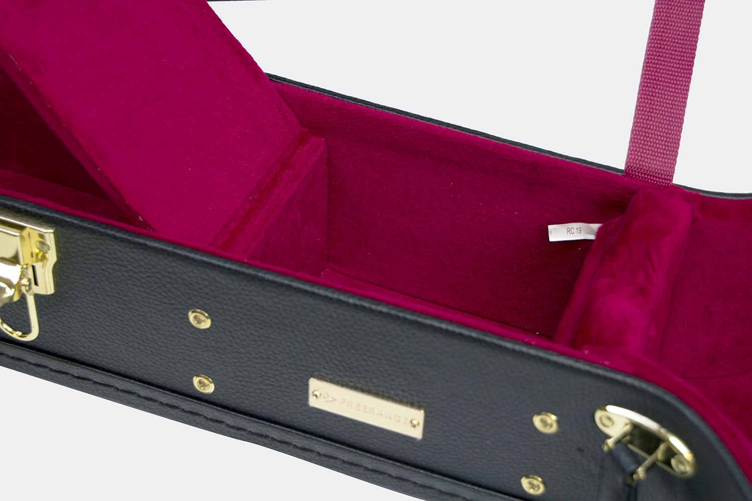 Woodcase av høy kvalitet som gir optimal beskyttelse for instrumentet ditt kombinert med et klassisk utseende. Yttermateriale i slitesterk svart tolex med fin struktur og beslag i gullfarget kraftig metall. Kassen kan låses med nøkkel. Metallføtter sitter velplasert på bunnen og på undersiden av etuiet. Innsiden er polstret og kledd med mørkerød fløyel. Ekstra polstring finns i lokket over kropp og hals. Tilbehørsrommet er av kraftig tre og er skrudd fast i etuiet for best mulig stabilitet. Det komfortable håndtaket vil glede deg hver gang du bærer instrumentet ditt i denne kassen. Innvendige mål 105x41x15cm