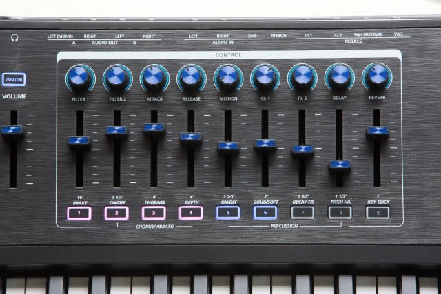 Front Panel Master Transport Controls Use the buttons in the TRANSPORT section to control recording and playback of the on-board 16-track sequencer. 36 Programmable Physical Controllers 9 Sliders, 9 Knobs, 10 Switches, 2 Wheels, 2 Switch Pedal* Inputs (which support half-damper for pianos), 2 Continuous Control Pedal Inputs, Aftertouch and Ribbon controller input**. *1 sustain/switch pedal is included; half-damper pedal sold separately **ribbon controller sold separately. Easy Access Transpose Controls Dedicated -/+ transpose controls conveniently located right above the LED backlit pitch/modulation wheels (LED lights can be disabled).
