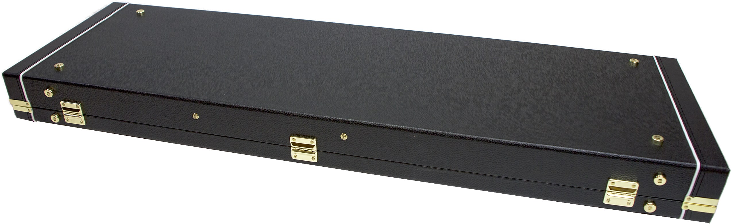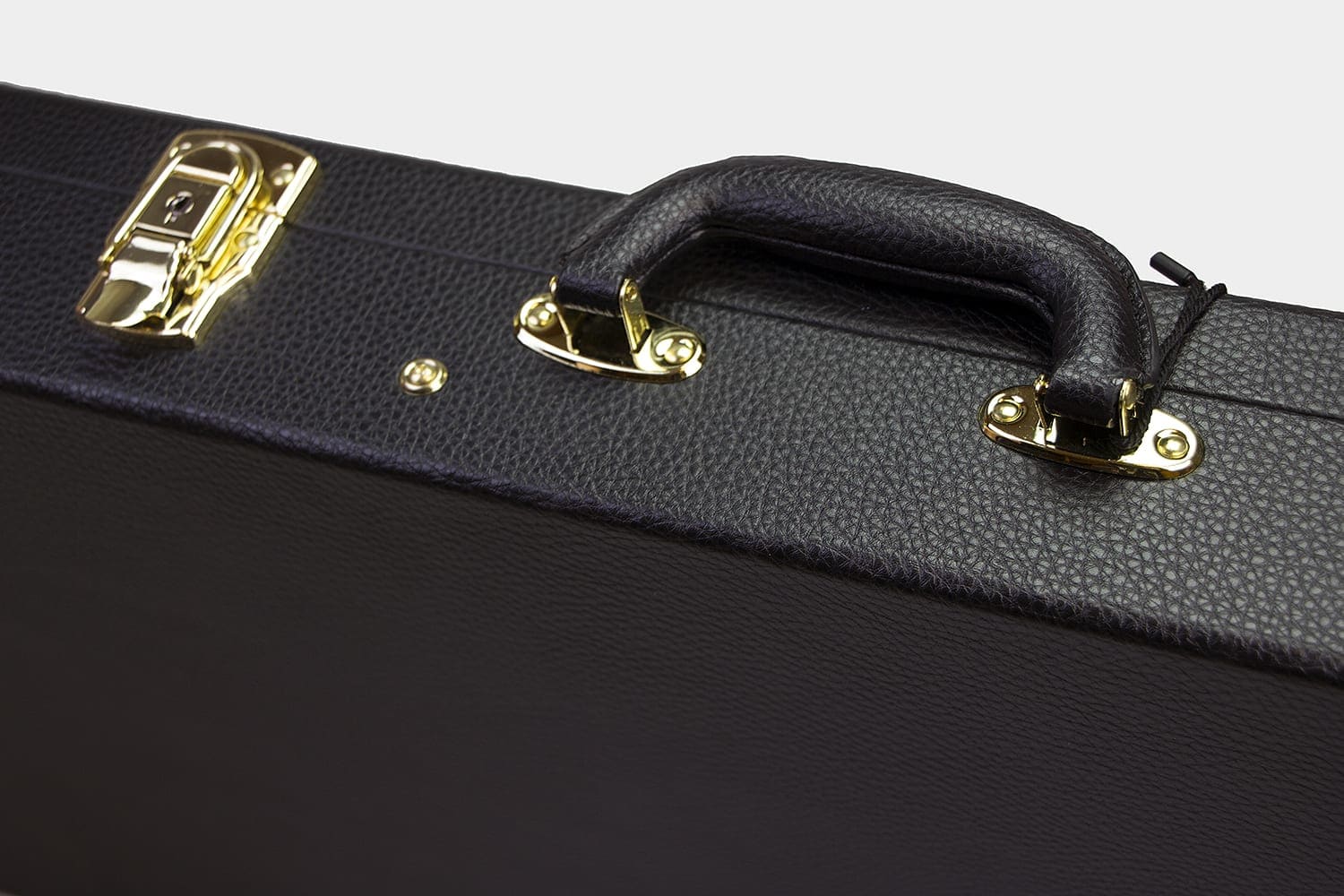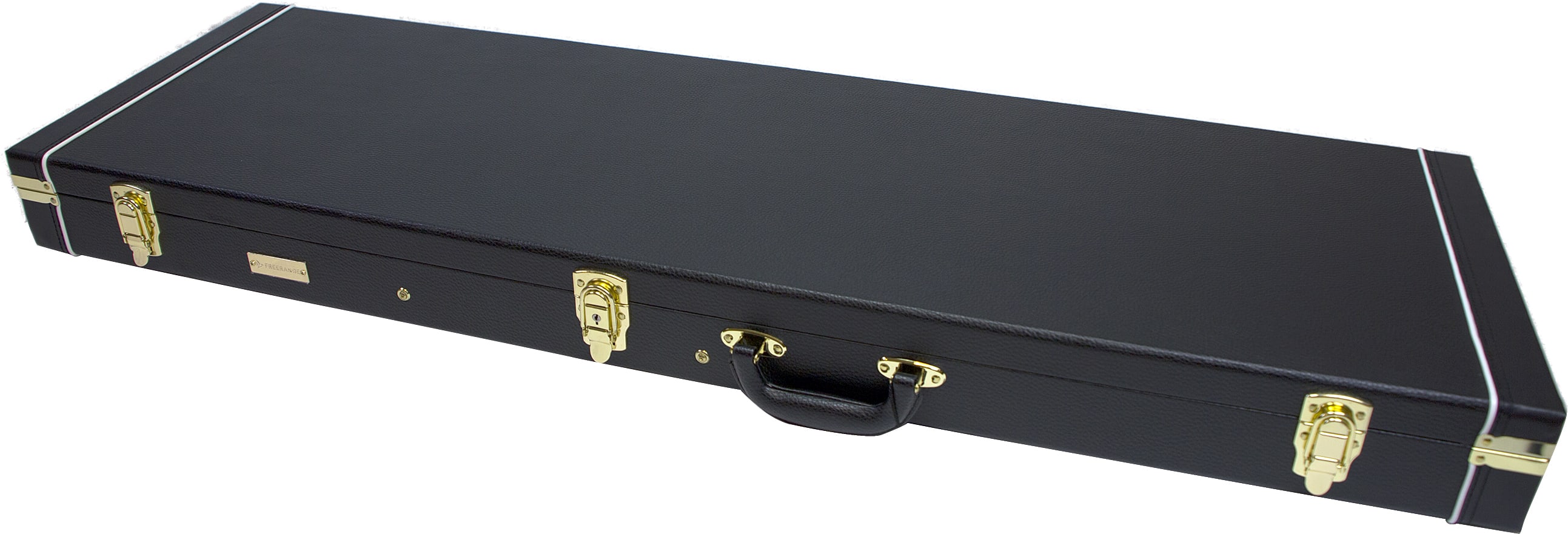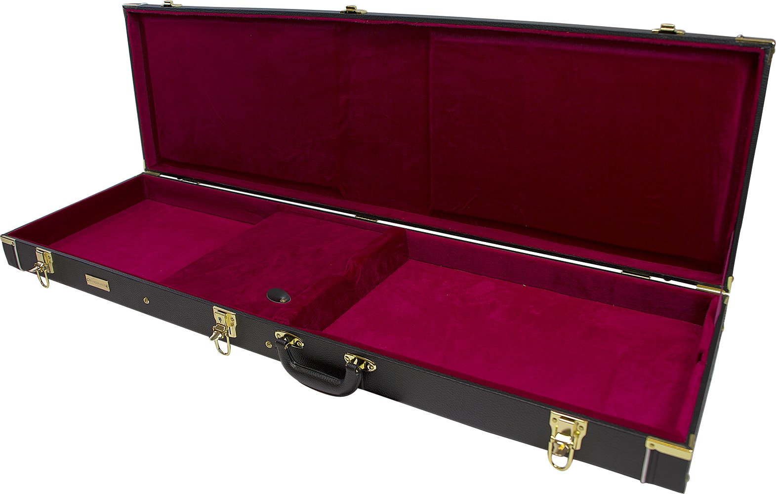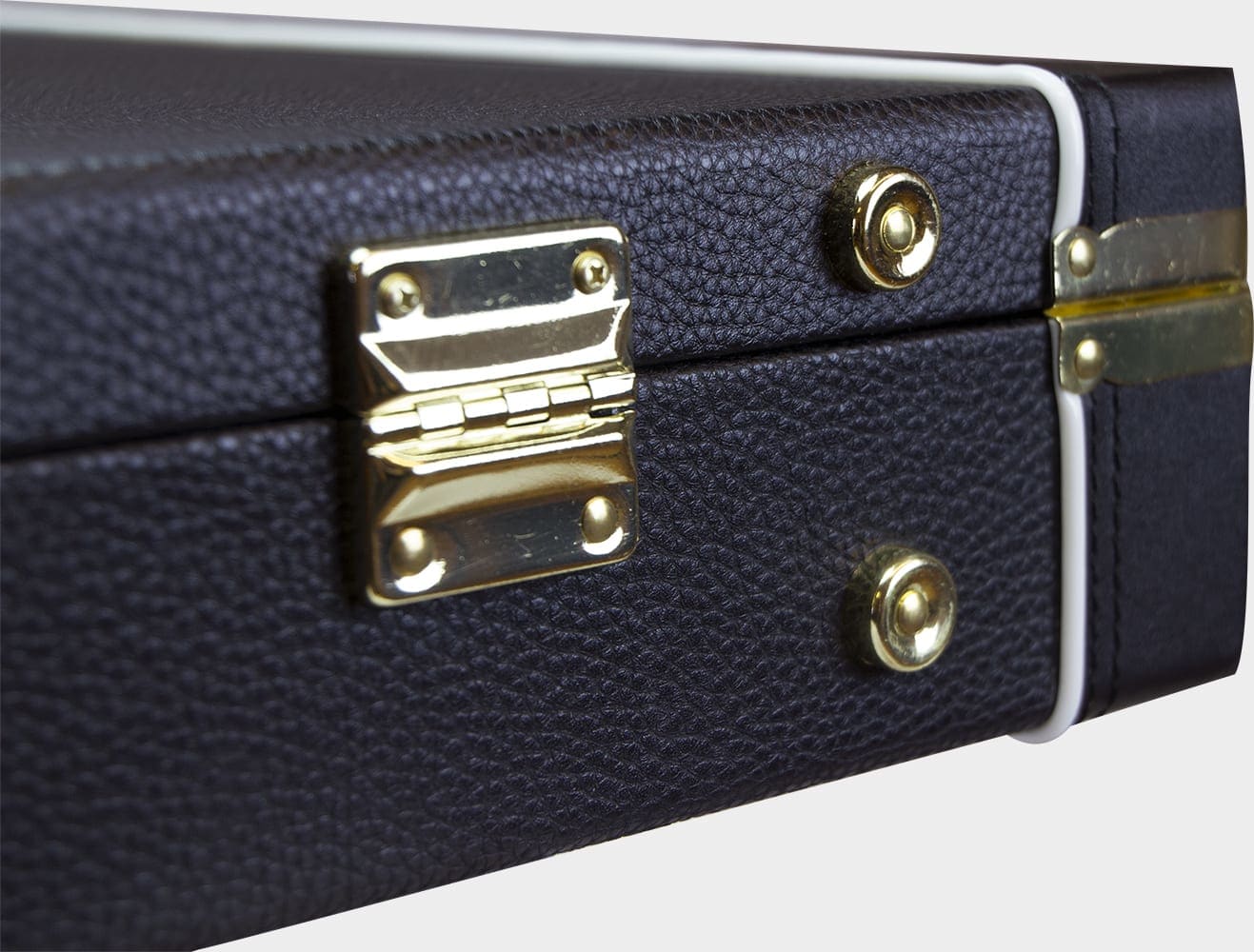 Woodcase av høy kvalitet som gir optimal beskyttelse for instrumentet ditt kombinert med et klassisk utseende. Yttermateriale i slitesterk svart tolex med fin struktur og beslag i gullfarget kraftig metall. Kassen kan låses med nøkkel. Metallføtter sitter velplasert på bunnen og på undersiden av etuiet. Innsiden er polstret og kledd med mørkerød fløyel. Ekstra polstring finns i lokket over kropp og hals. Tilbehørsrommet er av kraftig tre og er skrudd fast i etuiet for best mulig stabilitet. Det komfortable håndtaket vil glede deg hver gang du bærer instrumentet ditt i denne kassen.