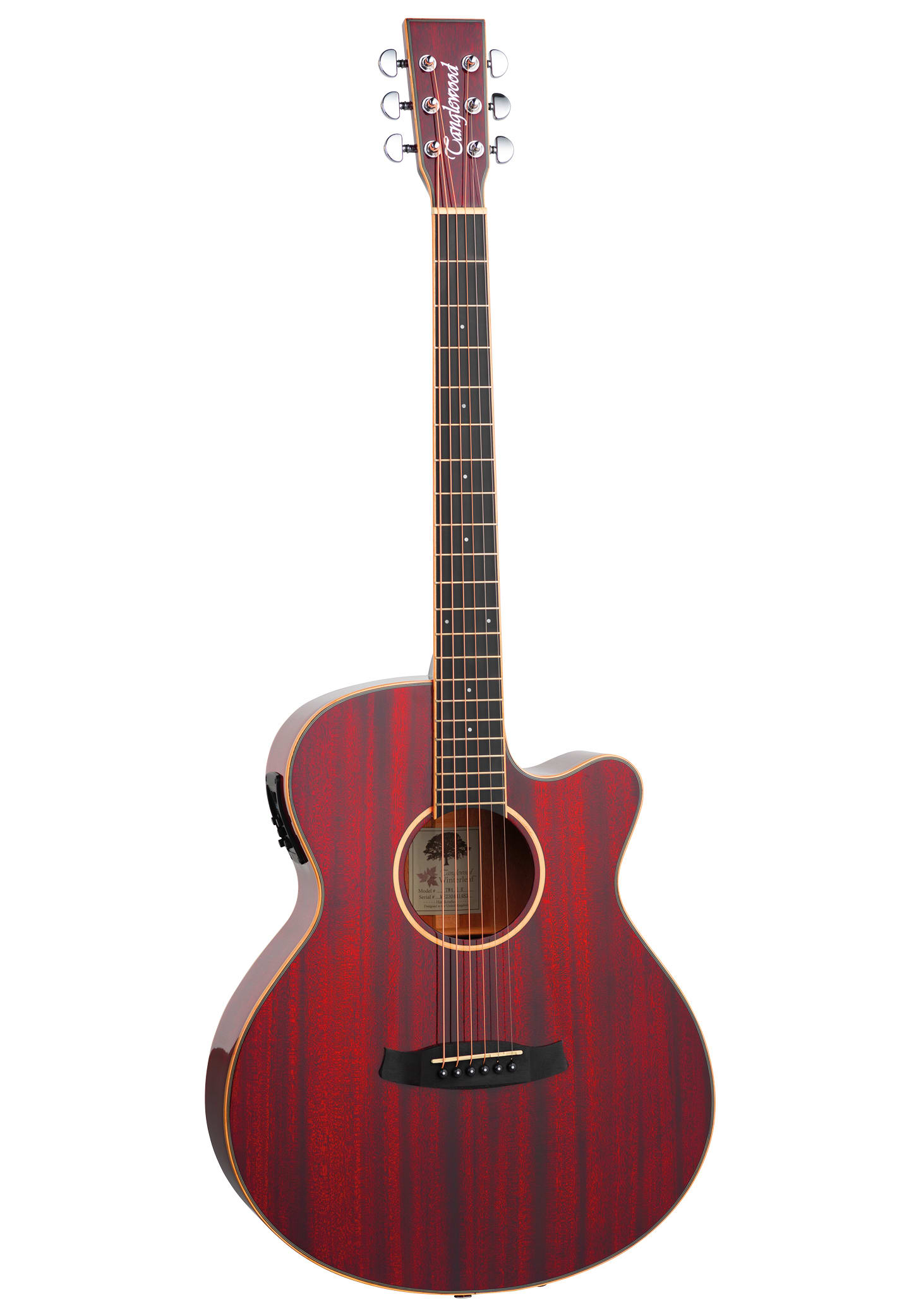 Super Folk stålstrengsgitar med lokk av solid mahogni og mahogni i bunn og sarg. Det gir en varm og resonant tone og en rik og balansert lyd som passer til mange ulike spillestiler og musikalske sjangere. Innebygd Tanglewood Premium Plus EQ pickup system som har en klar og naturlig tone og har kontroller som gjør det å enkelt forme lyden din. Red Gloss høyglansfinish.